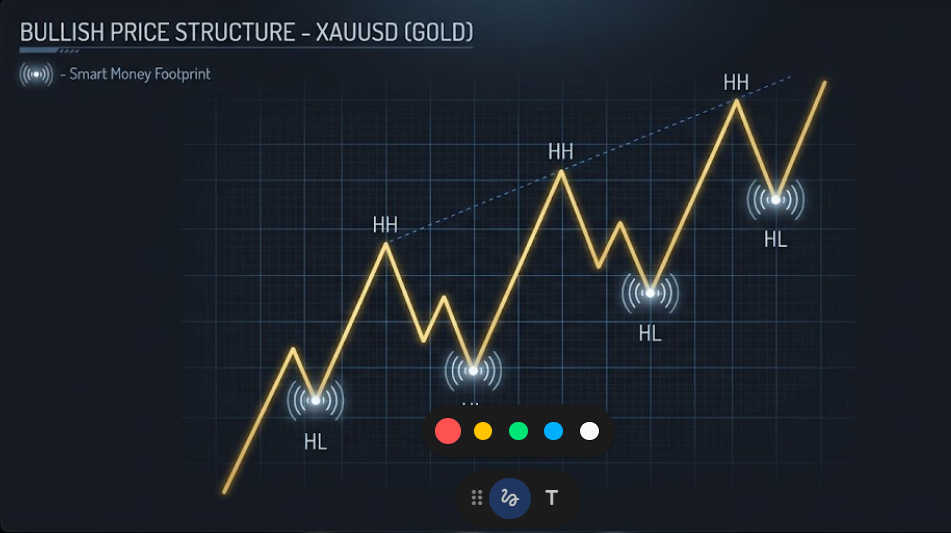 Market structure is the skeletal framework of price action, defining the underlying path of least resistance. To mentor a trader in Gold is to teach them to see the rhythm of the "swings." A bullish market structure is defined by a consistent sequence of Higher Highs (HH) and Higher Lows (HL). This structure signals that buyers are in control and are willing to buy the dips at progressively higher prices, indicating a fundamental imbalance where demand consistently outweighs supply. Conversely, a bearish structure consists of Lower Lows (LL) and Lower Highs (LH), reflecting a market where sellers dominate and every attempt at a rally is met with new selling pressure at lower levels.